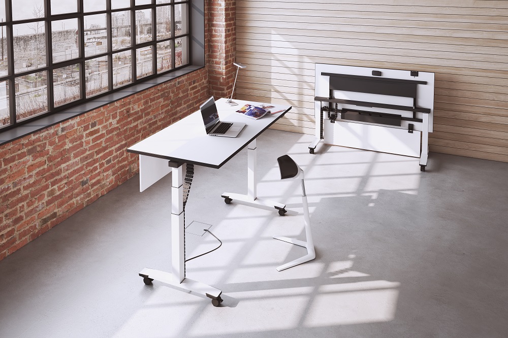OKA JumpFlex - Der ergonomische Weg zum flexiblen Arbeiten. JumpFlex unterstützt die flexible Arbeitsplatzgestaltung von Heute und ist speziell für den Einsatz in Seminarräumen, Coworking Spaces oder Mehrzweckräumen konzipiert. Eine Kombination aus elektromotorischer Höhenverstellung und mobilem Klapptisch ermöglicht eine hohe Flexibilität bei Berücksichtigung ergonomischer Belange. Sobald Platzbedarf besteht, ist die Tischplatte mit einem Handgriff zurückgeklappt und kann platzsparend zusammen mit weiteren JumpFlex Tischen verstaut werden.
