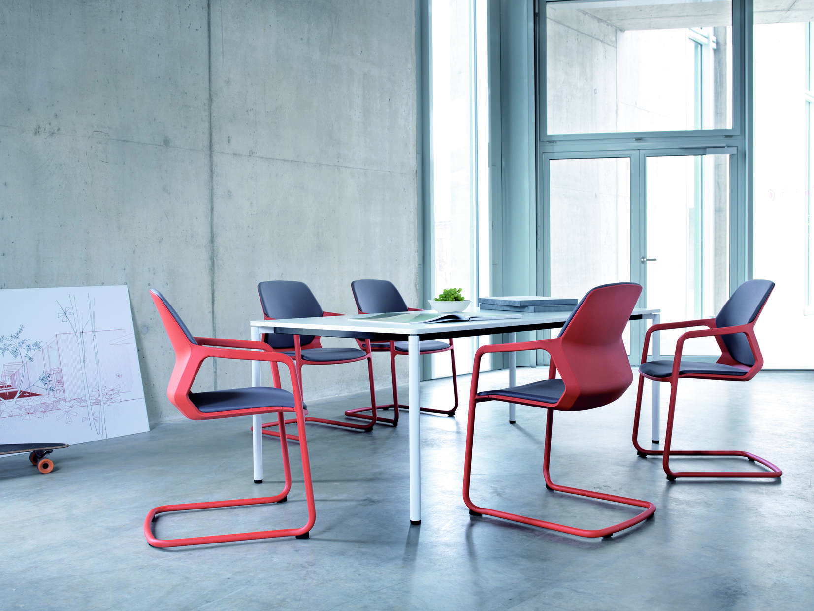 Mit den ON-typischen bespannten Rückenrahmen runden sie die breite Programmpalette ab. Für Einrichtungslösungen aus einem Guss. Der Vierbeiner verfügt über die gleiche Sitz-Rücken-Konstruktion wie der Freischwinger. Auch der ähnlich ausgeführte Rückenbügel verweist auf die ON-Familie. Analog sind Ausführungen mit Fiberflex- oder Stoffbezug (stapelbar) und mit Management-Polsterung verfügbar.