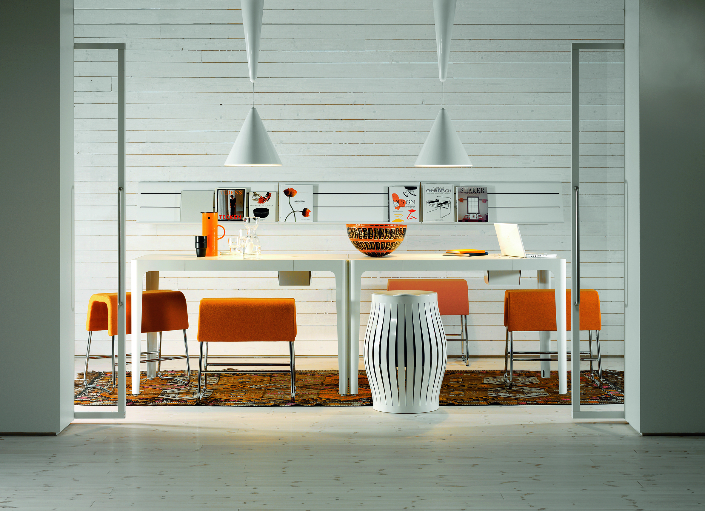 Ein Stehpult mit im Fuß eingelassenen Rollen und einer Ablage in Melamin, Furnier oder als Vollkernplatte sowie die vielfältig einsetzbaren Center-Tische mit ihrer breiten Auswahl an Fußdesigns runden die Meeting-Serie ab.