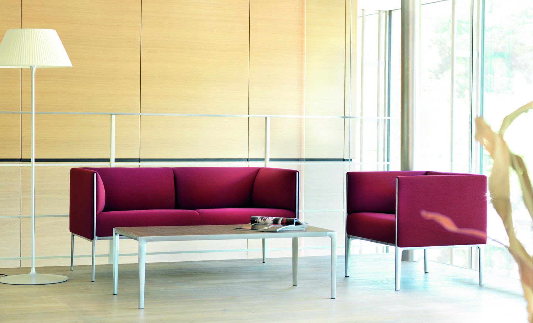 Das Sessel- und Sofaprogramm verbindet höchste repräsentative Ansprüche mit markanter Gestaltung und bestechendem Sitzkomfort. Das filigrane Aluminiumgestell mit überwölbten Querschnitten und organischen Übergängen bildet die markante Kontur, um die sich die Polster der kubischen Sitzkörper herumzulegen scheinen: außen dünn und flächig, nach innen mit deutlicher Wölbung. Weich in der Form, straff in der Konsistenz bieten sie für unterschiedliche Sitzpositionen komfortablen halt. Die Kuben wirken von den edlen Bezügen wie aus einem Stück verpackt. Sie bilden eine spannende Interpretation klassischer Formen mit klarer Präzision und wohnlicher Anmutung.